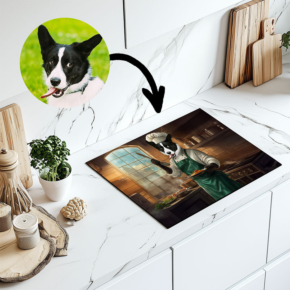 Breng een glimlach in je keuken met deze unieke inductiebeschermer, bedrukt met een bewerkte foto van jouw huisdier in een komisch chef-kostuum. Of het nu je hond is met een koksmuts of je kat in een schort met pollepel – jouw trouwe viervoeter wordt het culinaire middelpunt van de keuken!