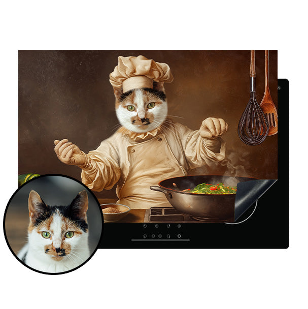 Breng een glimlach in je keuken met deze unieke inductiebeschermer, bedrukt met een bewerkte foto van jouw vriend, familielid of huisdier in een komisch Kok-kostuum.